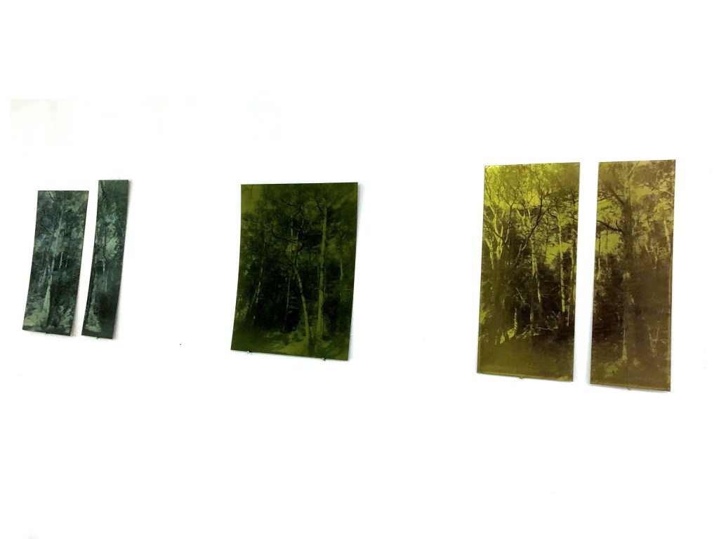 The Alum Chine is the name of a pathway through the Westbourne pine forests to the beaches on the other side. ‘Chine’ meaning ravine where water once flowed, and ‘alum’ because it is the place where the first chemical works existed in Britain- to extract, manufacture and mine alum and copperas or green vitriol used to fix the colours and tan the leather with a black dye, used in the textile and dyeing industry in Dorset in the late 16th century. However, by the mid 17th century mining had ceased due to the fact that it became increasingly uneconomical to extract the deposits. This story of the earliest mineral and chemical manufacturing in the UK has been all but lost to history. These days, ferrous sulphate (copperas) is used to treat anaemia-something I have suffered from and have to take. These pine trees grow tall and strong on the iron rich deposits left where alum and copperas were first extracted, as trees (that can also suffer from iron deficiency) need iron to produce chlorophyll- the pigments and processes used in these photo etchings, explore the colour and chemical industry, and echo the histories of the place as the image is ‘fixed’ and pigmented with green/ blue inks and hand made pigments (created from collected stone and earth from the alum chine itself). The inked photo etching plates are used as outcomes as well as printing matrices. They will eventually fade if left out in the light for prolonged periods, much like our forests which are rapidly disappearing around us. Aluminium, or alum, extracted on this site, is used in polaroid strips, in these polymer plates and in salts to treat human afflictions as well as plant afflictions. They remind me of our place in the world and the anthropocenic layers we are creating for posterity, in the midst of a rapidly changing environmental crisis. These places can always renew themselves, and adapt to new conditions, even perhaps recover. The question is, can we?