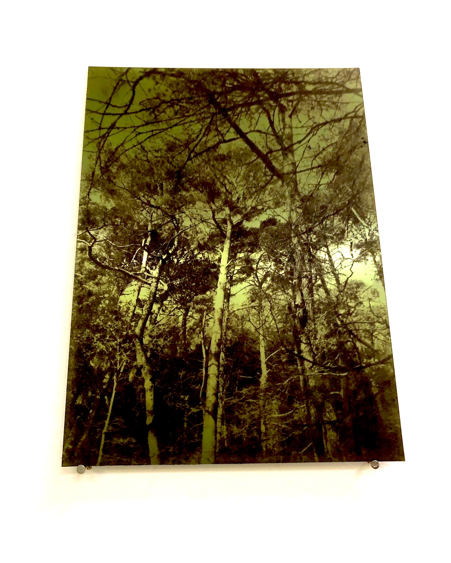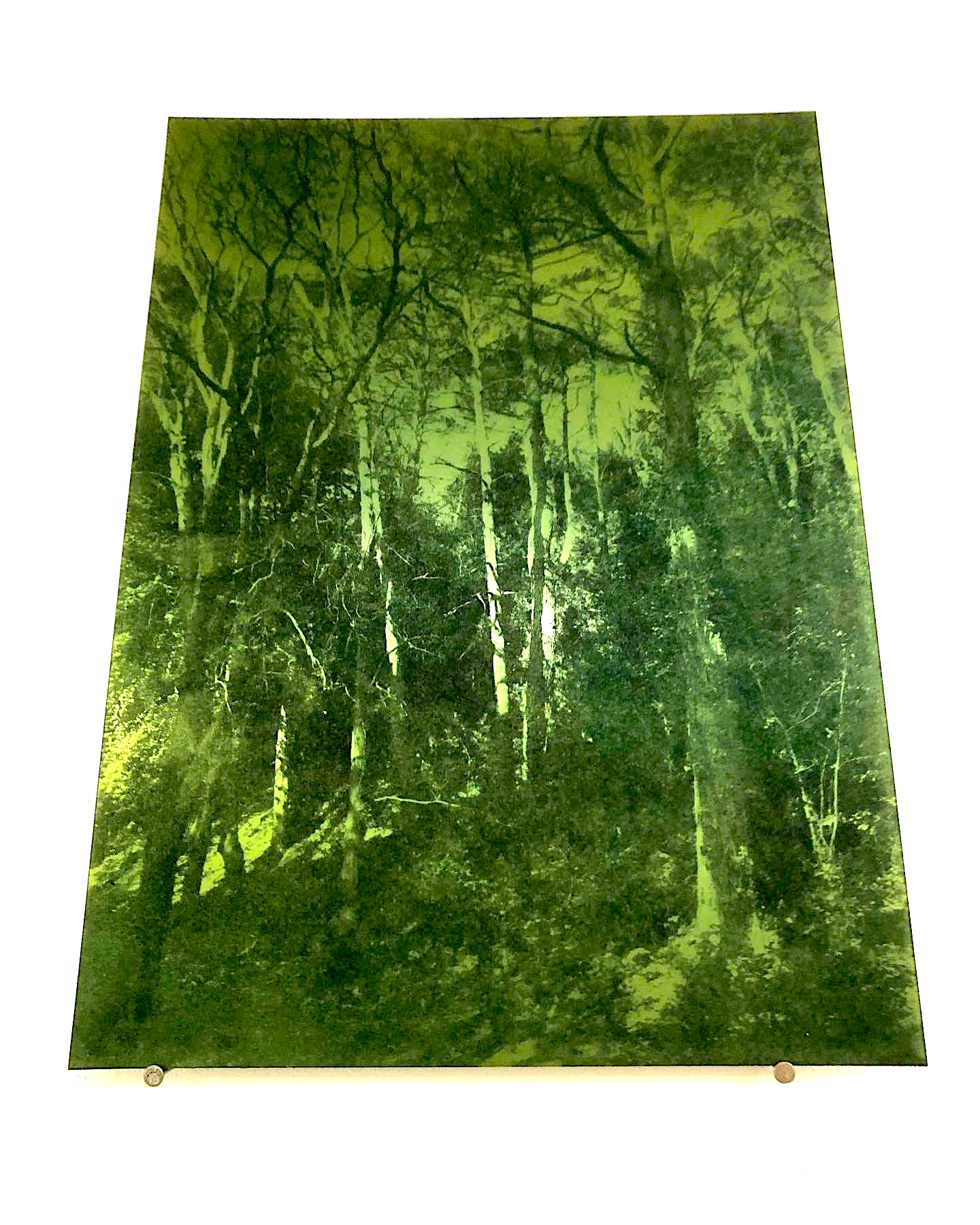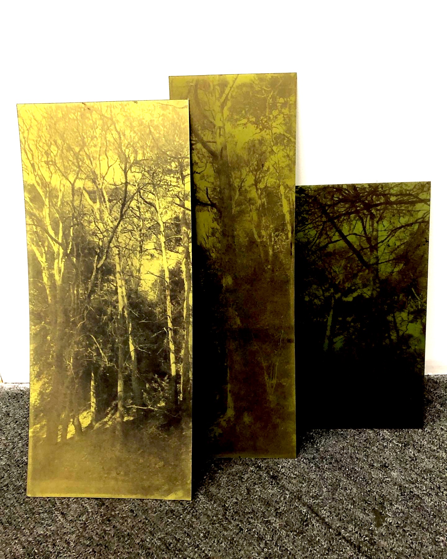 The Alum Chine is the name of a pathway through the Westbourne pine forests to the beaches on the other side. ‘Chine’ meaning ravine where water once flowed, and ‘alum’ because it is the place where the first chemical works existed in Britain- to extract, manufacture and mine alum and copperas or green vitriol used to fix the colours and tan the leather with a black dye, used in the textile and dyeing industry in Dorset in the late 16th century. However, by the mid 17th century mining had ceased due to the fact that it became increasingly uneconomical to extract the deposits. This story of the earliest mineral and chemical manufacturing in the UK has been all but lost to history. These days, ferrous sulphate (copperas) is used to treat anaemia-something I have suffered from and have to take. These pine trees grow tall and strong on the iron rich deposits left where alum and copperas were first extracted, as trees (that can also suffer from iron deficiency) need iron to produce chlorophyll- the pigments and processes used in these photo etchings, explore the colour and chemical industry, and echo the histories of the place as the image is ‘fixed’ and pigmented with green/ blue inks and hand made pigments (created from collected stone and earth from the alum chine itself). The inked photo etching plates are used as outcomes as well as printing matrices. They will eventually fade if left out in the light for prolonged periods, much like our forests which are rapidly disappearing around us. Aluminium, or alum, extracted on this site, is used in polaroid strips, in these polymer plates and in salts to treat human afflictions as well as plant afflictions. They remind me of our place in the world and the anthropocenic layers we are creating for posterity, in the midst of a rapidly changing environmental crisis. These places can always renew themselves, and adapt to new conditions, even perhaps recover. The question is, can we?